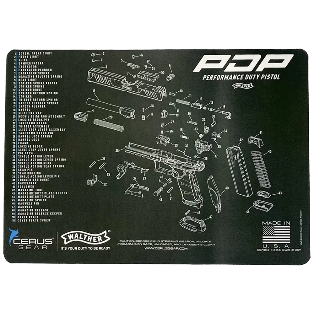 Maintain your PDP with precision using the Walther Gun Schematic Cleaning Mat. This lightweight, heavy-duty mat features a detailed PDP schematic, making it the perfect workbench companion for cleaning and assembly. Measuring 12” x 17”, its padded surface protects your firearm from scratches, while the non-slip rubber base keeps it steady and safeguards your workspace. Built from durable vulcanized rubber and polyester, it’s oil and solvent resistant for lasting use.